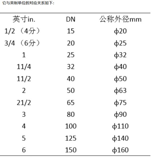 注意:這既不是外徑也不是內(nèi)徑;應(yīng)該與管道工程發(fā)展初期與英制單位有關(guān);通常用來描述鍍鋅鋼管,它與英制單位的對應(yīng)關(guān)系如下:
