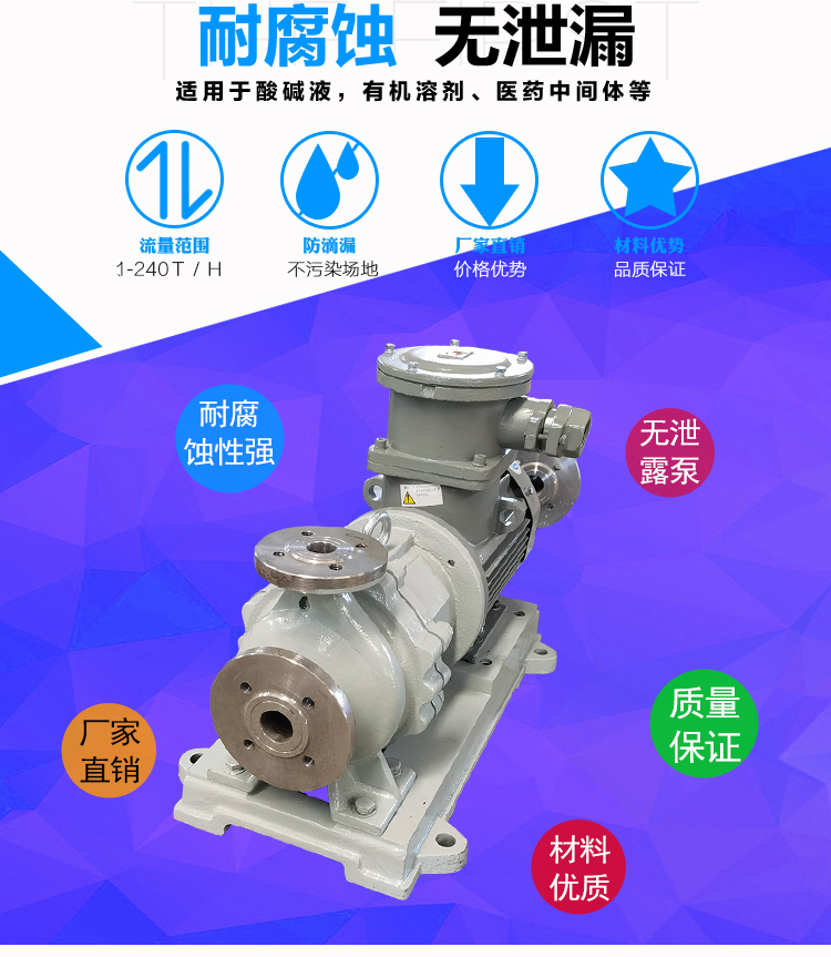 CQB不銹鋼磁力泵過流部件采用全不銹鋼材料(304、316、316L),內(nèi)、外磁轉(zhuǎn)子選用高磁能積、高矯頑力的稀土永磁制造,具有高效節(jié)能、介質(zhì)適用面廣、耐高溫、磁性強、不退磁等優(yōu)點,對有機酸,有機化合物,堿,中性溶液和各種氣體都有良好的耐蝕性,雙螺旋糟碳石墨軸承和硬質(zhì)合金軸套,具有較強的耐磨性,是應用磁力耦合實現(xiàn)無接觸傳動、無動密封的新型高品質(zhì)磁力化工泵。保證了產(chǎn)品的壽命,是無泄漏輸送腐蝕性介質(zhì)的用泵。