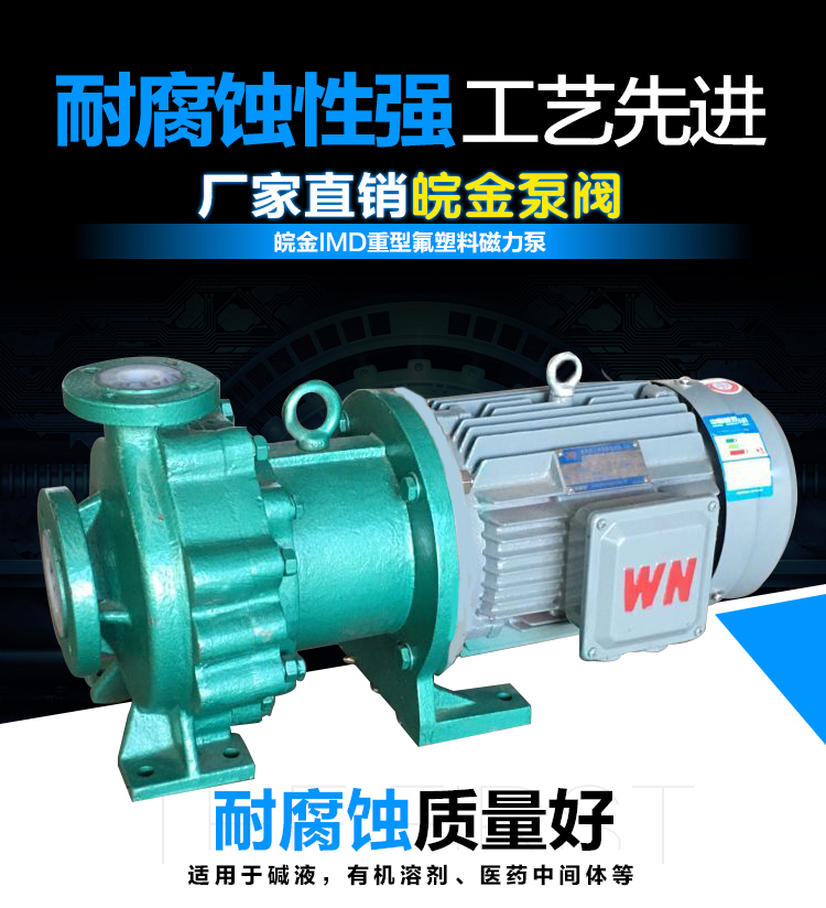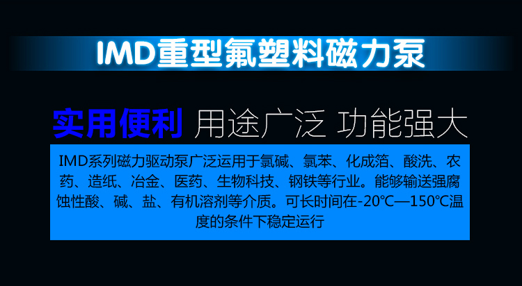 IMD系列氟塑料磁力驅(qū)動泵,耐強(qiáng)腐蝕,無泄漏,泵殼有底腳,泵和電機(jī)固定在共用的的底座上,穩(wěn)定性好,運(yùn)行噪音和振動更低。結(jié)構(gòu)設(shè)計(jì)為后拉式,檢修、更換零部件時,可將核心部件直接從后面抽出,不用拆卸管路和底座,節(jié)省了工時維護(hù)和成本,極大地方便了客戶。該泵應(yīng)用現(xiàn)代磁力學(xué)原理,利用永磁體實(shí)現(xiàn)無接觸間接傳動的一種化工流程泵。當(dāng)電機(jī)帶動外轉(zhuǎn)子(即外磁鋼)總成旋轉(zhuǎn)時,通過磁場的作用磁力線穿過隔離套帶動內(nèi)轉(zhuǎn)子(即內(nèi)磁鋼)總成和葉輪同步旋轉(zhuǎn),介質(zhì)完全封閉在靜止的隔離套內(nèi),從而達(dá)到不泄漏抽送介質(zhì)的目的,解決了機(jī)械傳動泵的軸封泄漏,是全密封、無污染的化工磁力泵。