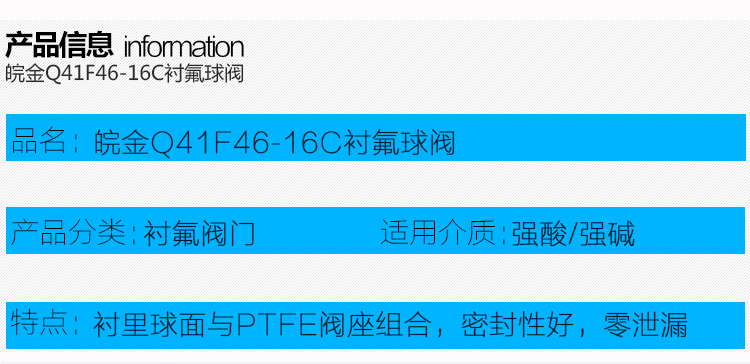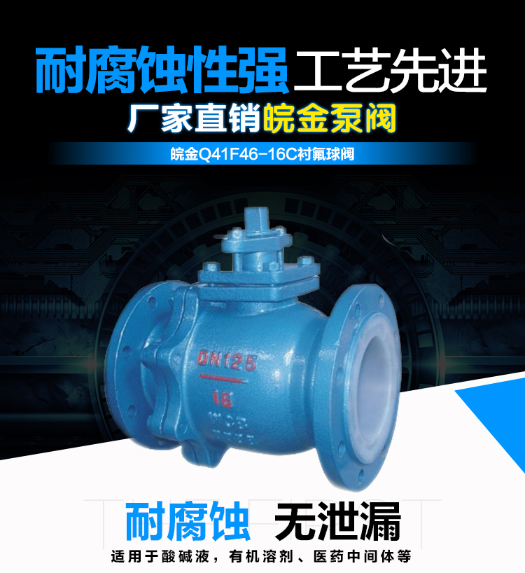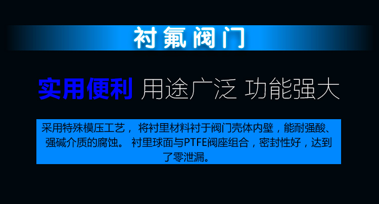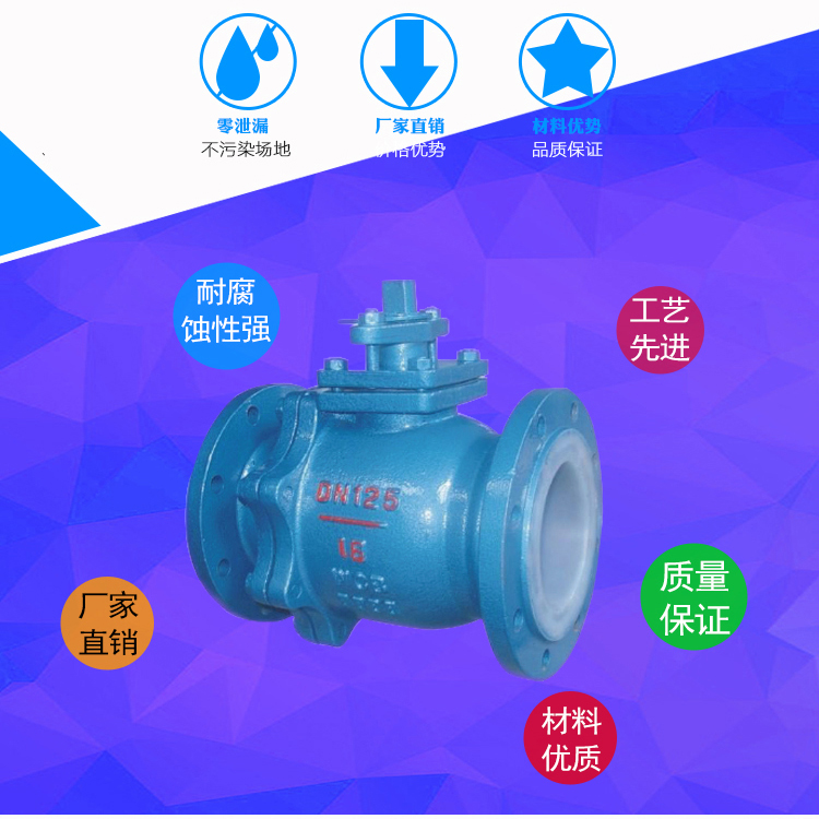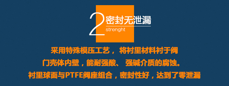 1、采用特殊模壓工藝, 將襯里材料襯于閥門殼體內(nèi)壁,能耐強酸、 強堿介質(zhì)的腐蝕。 襯里球面與PTFE閥座組合,密封性好。