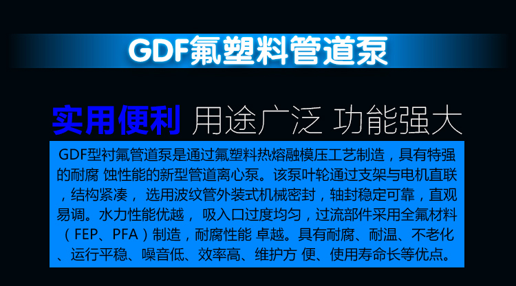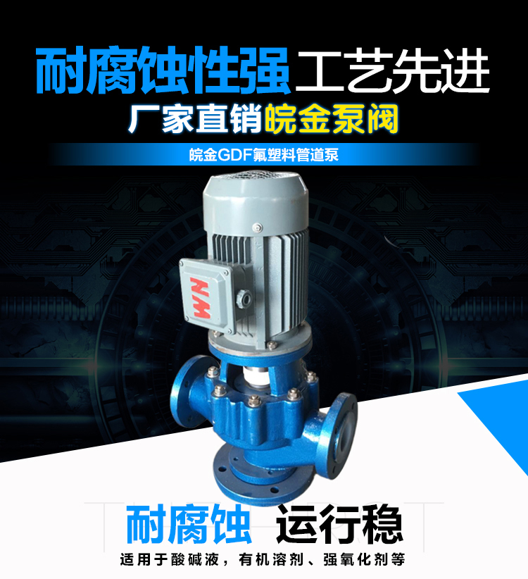 GDF氟塑料管道泵是通過氟塑料熱熔融模壓工藝制造,具有特強的耐腐 蝕性能的管道離心泵。該泵葉輪通過支架與電機直聯(lián),結構緊湊, 選用波紋管外裝式機械密封,軸封穩(wěn)定可靠,直觀易調。水力性能優(yōu), 吸入口過度均勻,過流部件采用全氟材料(FEP、PFA)制造,耐腐性能 卓越。具有耐腐、耐溫、不老化、運行平穩(wěn)、噪音低、效率高、維護方 便、使用壽命長等優(yōu)點。