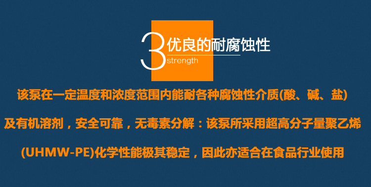 5、安全可靠,無(wú)毒素分解:該泵所采用超高分子量聚乙烯(UHMW-PE)化學(xué)性能極其穩(wěn)定,因此亦適合在食品行業(yè)使用。