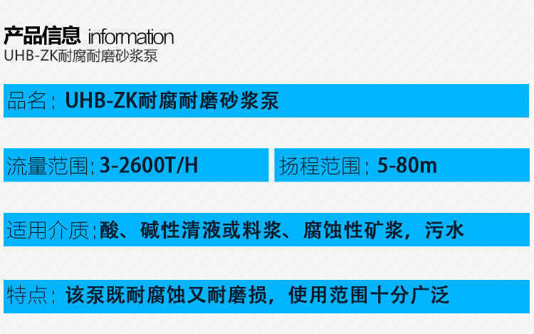 UHB-ZK耐腐耐磨砂漿泵能適應(yīng)各種不同的工況。如:既可以傳送酸、堿類清液或料漿,也可以輸送冶煉行業(yè)各種腐蝕性礦漿,還可以輸送硫酸行業(yè)各類稀酸、環(huán)保行業(yè)的各類污水等??奢斔蜐舛?0%以下的硫酸、50%以下的硝酸、鹽酸等積各類酸、堿、鹽的料漿,稀有金屬冶煉行業(yè)的各種腐蝕性砂漿及食品,酒類行業(yè)中的各類混合型介質(zhì)。該泵既耐腐蝕又耐磨損,使用范圍十分廣泛。