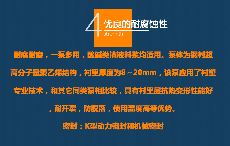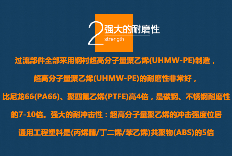 1、強(qiáng)大的耐磨性:過(guò)流部件全部采用鋼襯超高分子量聚乙烯(UHMW-PE)制造,超高分子量聚乙烯(UHMW-PE)的耐磨性,比尼龍66(PA66)、聚四氟乙烯(PTFE)高4倍,是碳鋼、不銹鋼耐磨性的7-10倍。