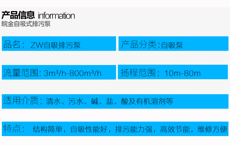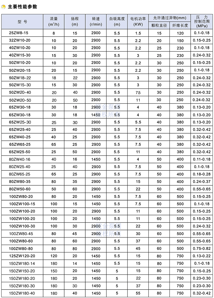 ZW自吸排污泵與國內同類產品相比,具有結構簡單,自吸性能好,(自吸高度可達5m),排污能力強,高效節(jié)能,維修方便(可替代WQ、QW潛污泵)等。
